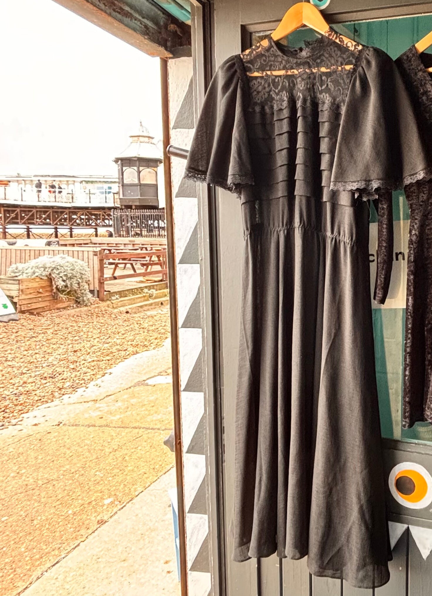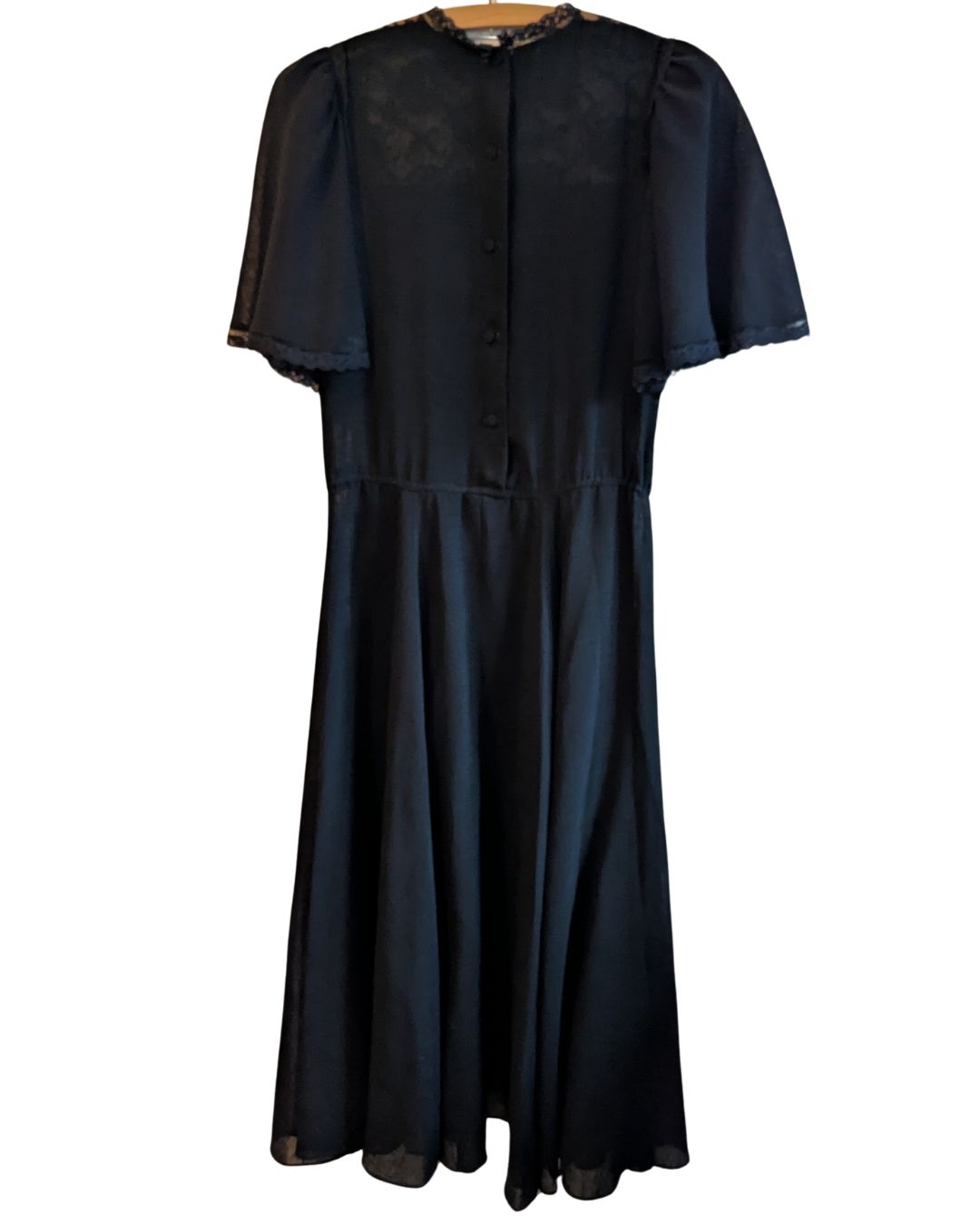 Embrace your inner goth goddess with this stunning vintage black lace dress, a timeless piece that channels dark romance and effortless elegance. With a silhouette straight out of a Wednesday Addams daydream, this dress is perfect for lovers of vintage gothic fashion.