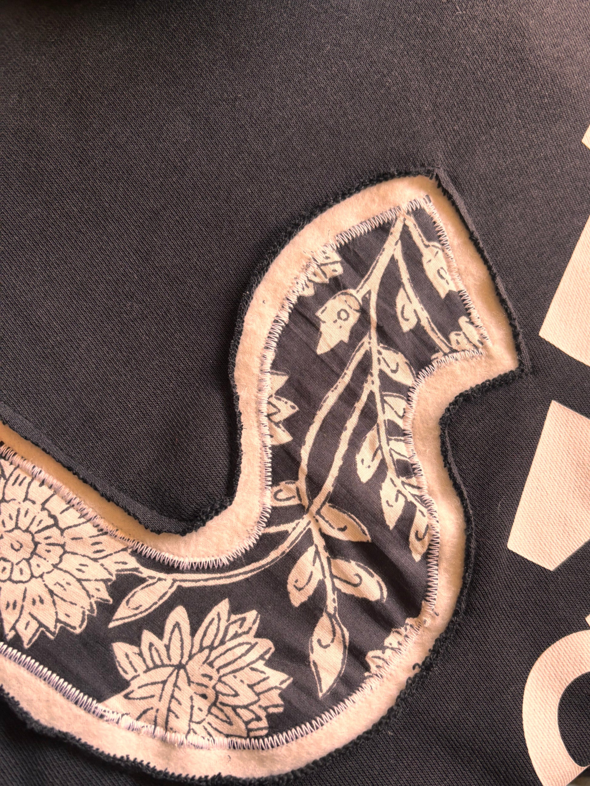 Stand out in a one-off upcycled Adidas hoodie. This preloved Adidas sweatshirt has been transformed with hand-cut, machine-stitched patchwork appliqué using recycled patterned fabrics. Each patch is individually placed and stitched, making this piece truly unique.