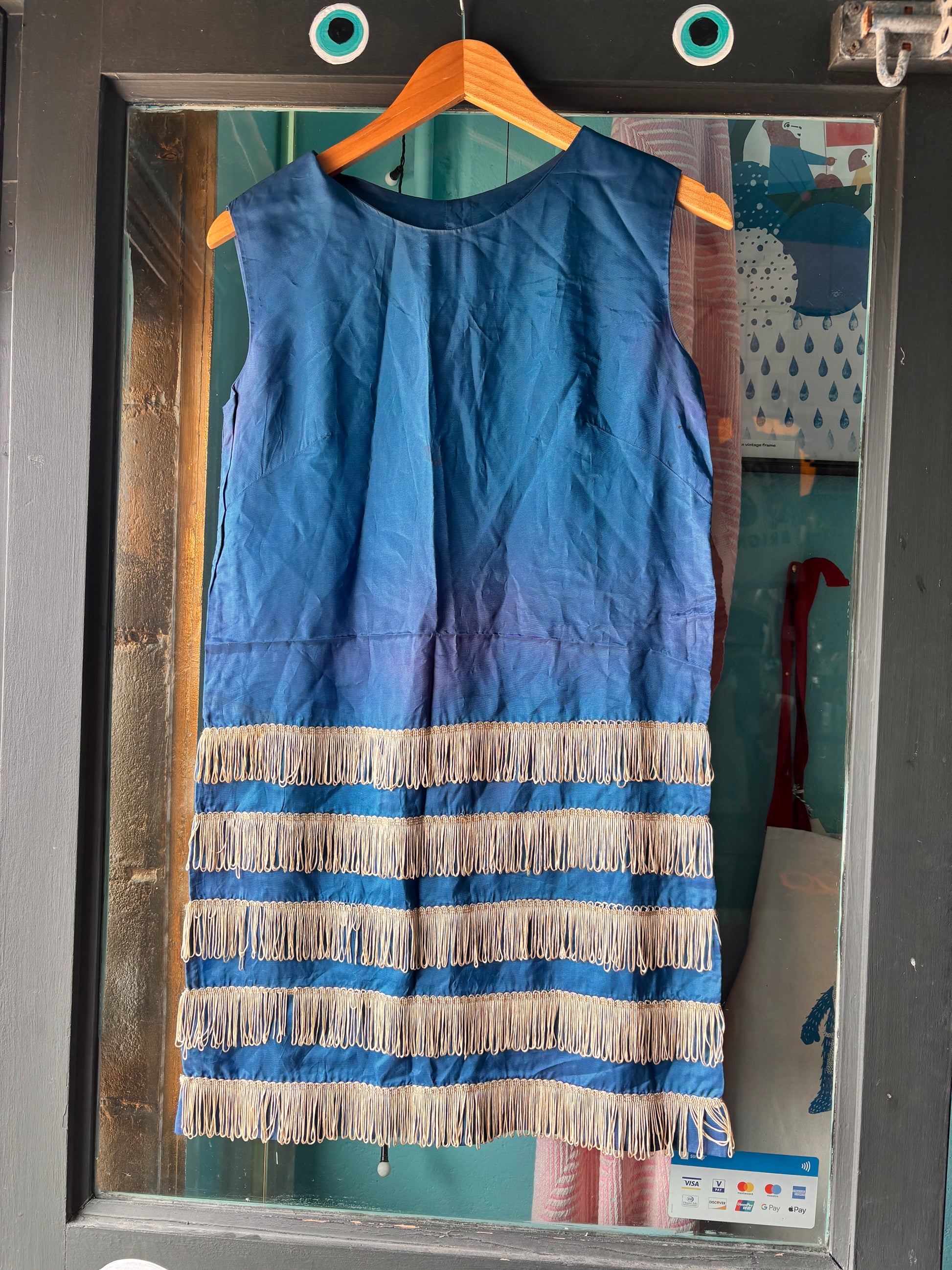 Bright, bold and ready for a party! This striking blue sleeveless dress with layered ivory fringe is likely an ex-theatre or dance costume, giving it extra character and stage-ready movement.
