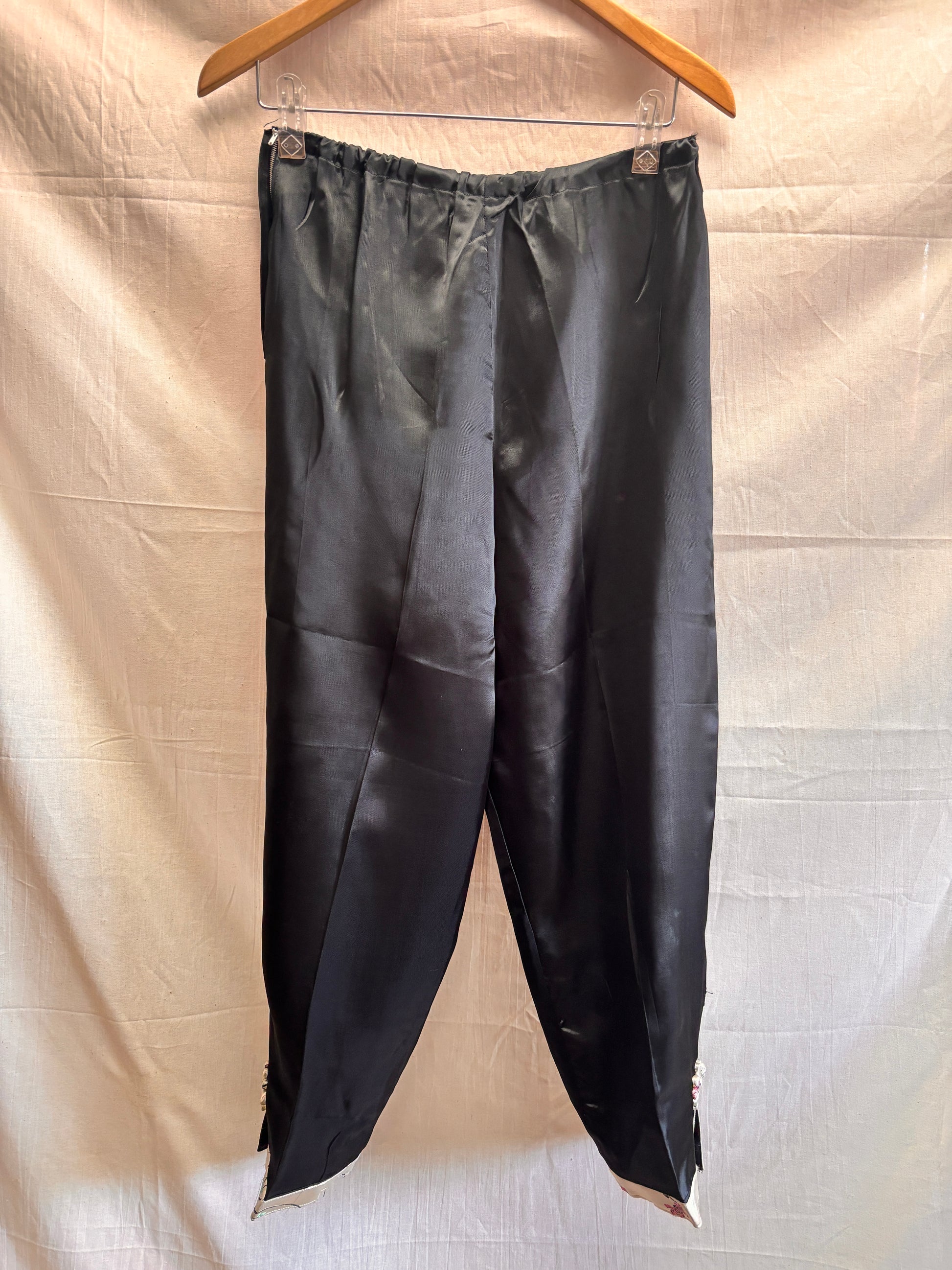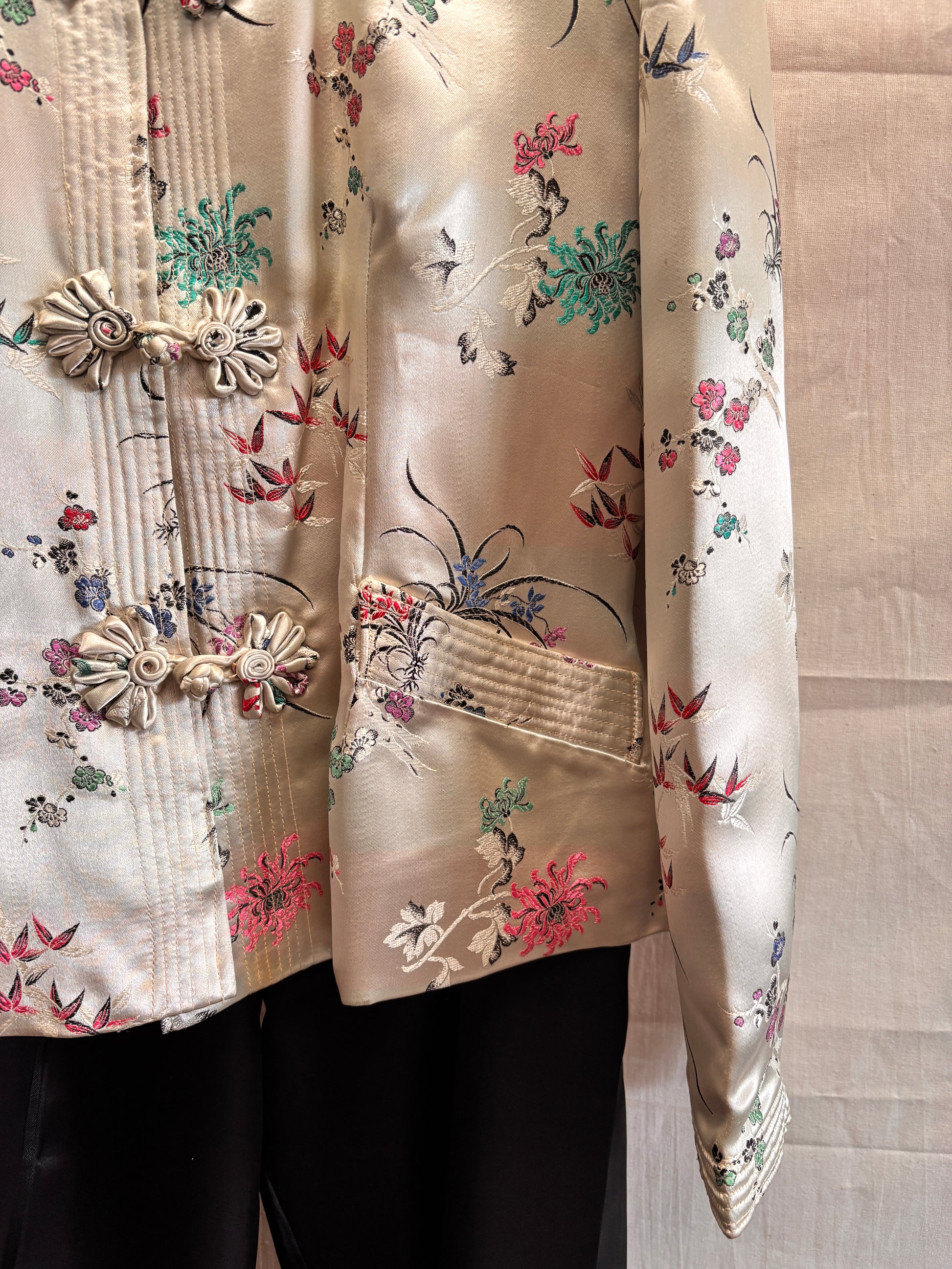 A rare vintage two-piece lounge set from the 1960s, featuring a champagne satin jacket with intricate floral detailing and traditional frog button fastenings, paired with black satin trousers with matching trim.
