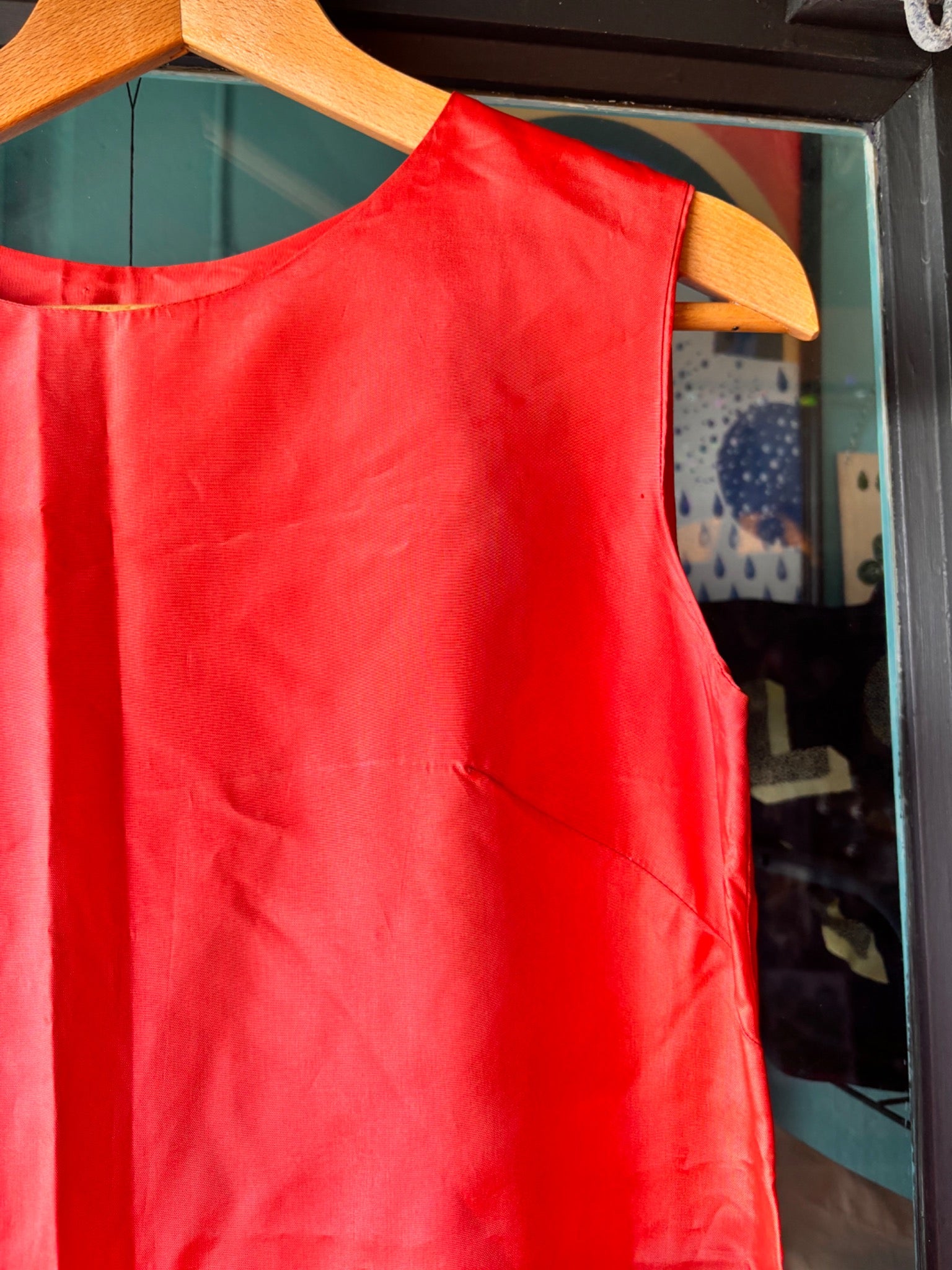 Bright, bold and ready for a party! This striking red sleeveless dress with layered ivory fringe is likely an ex-theatre or dance costume, giving it extra character and stage-ready movement.