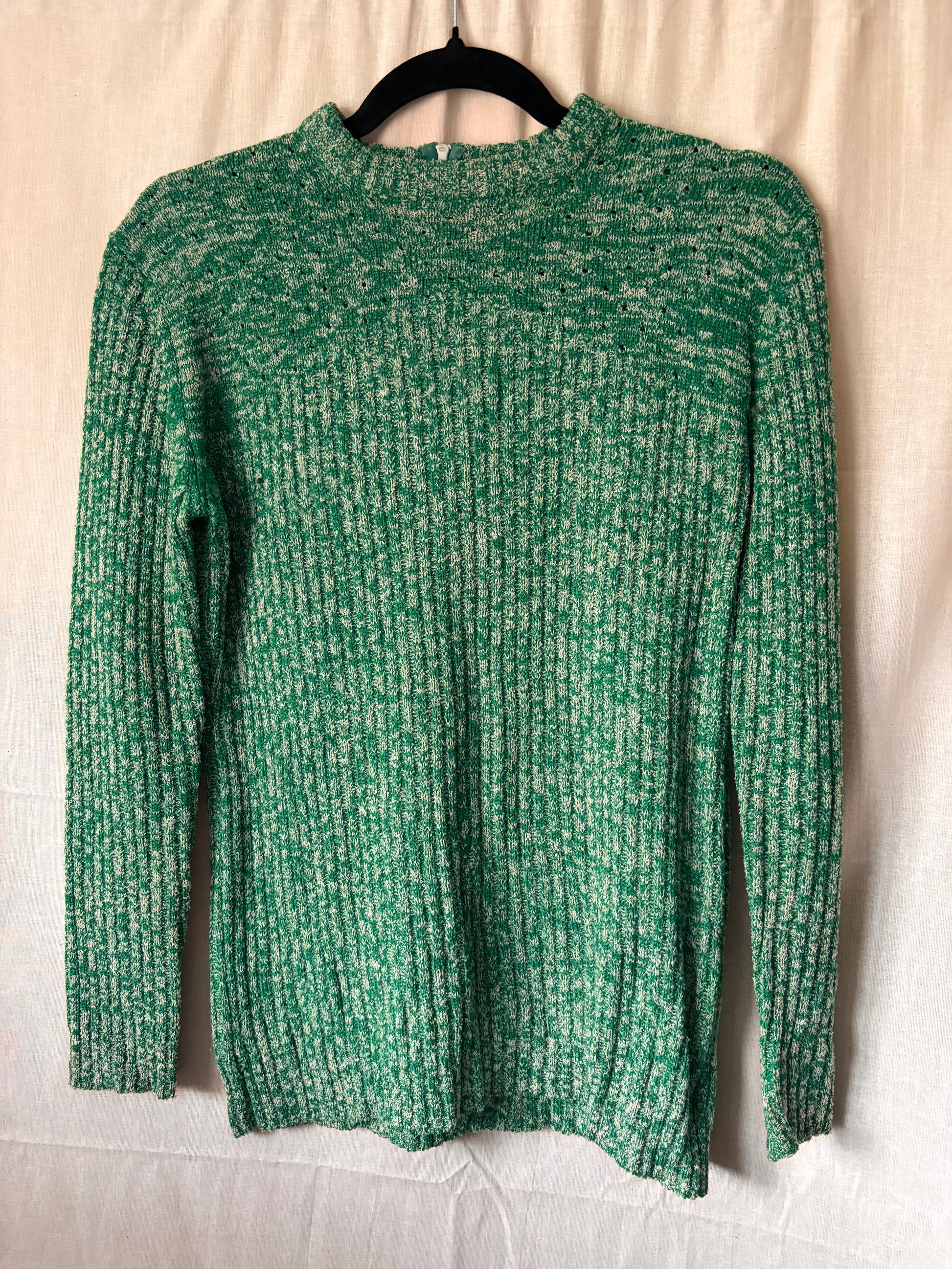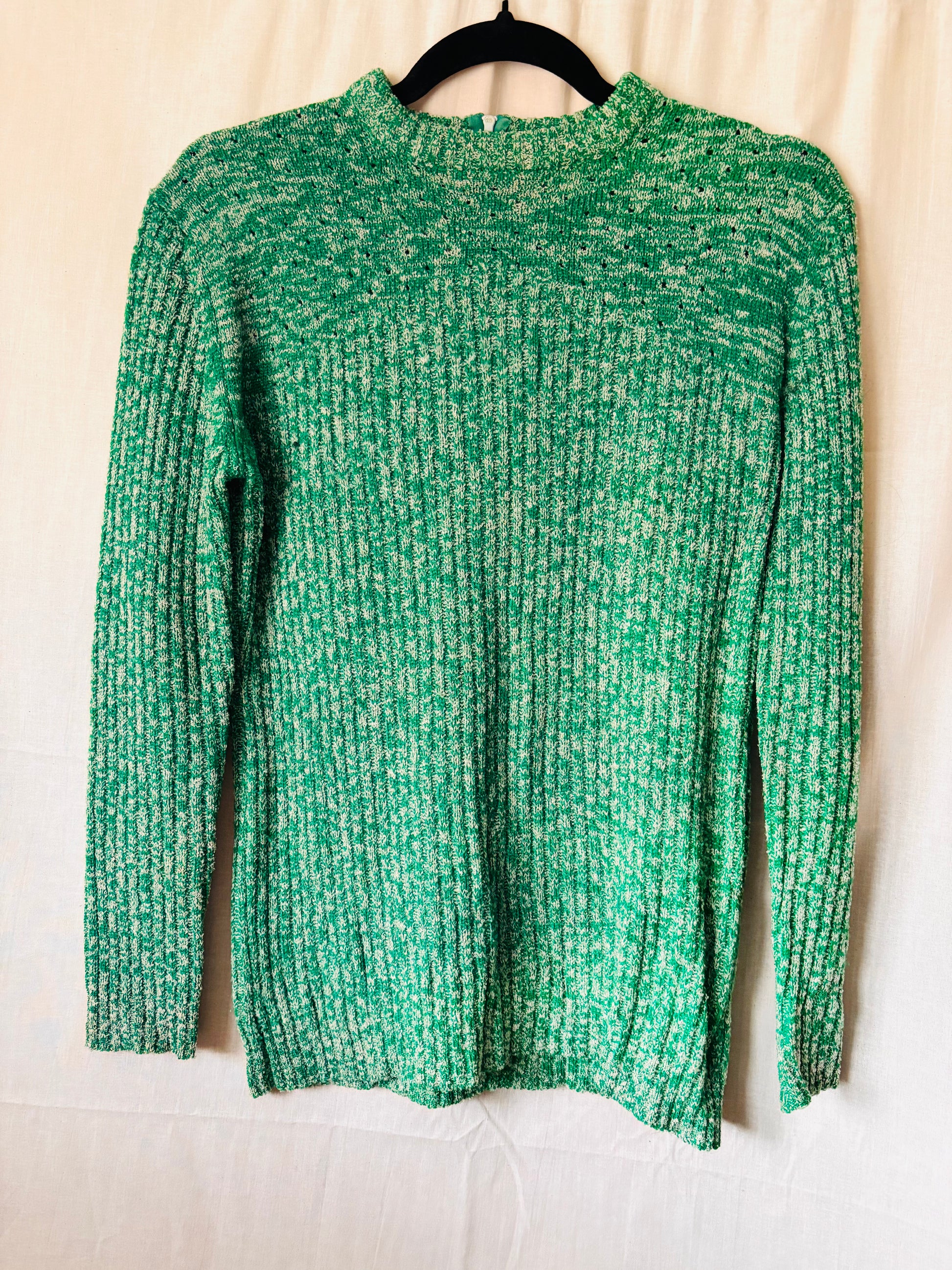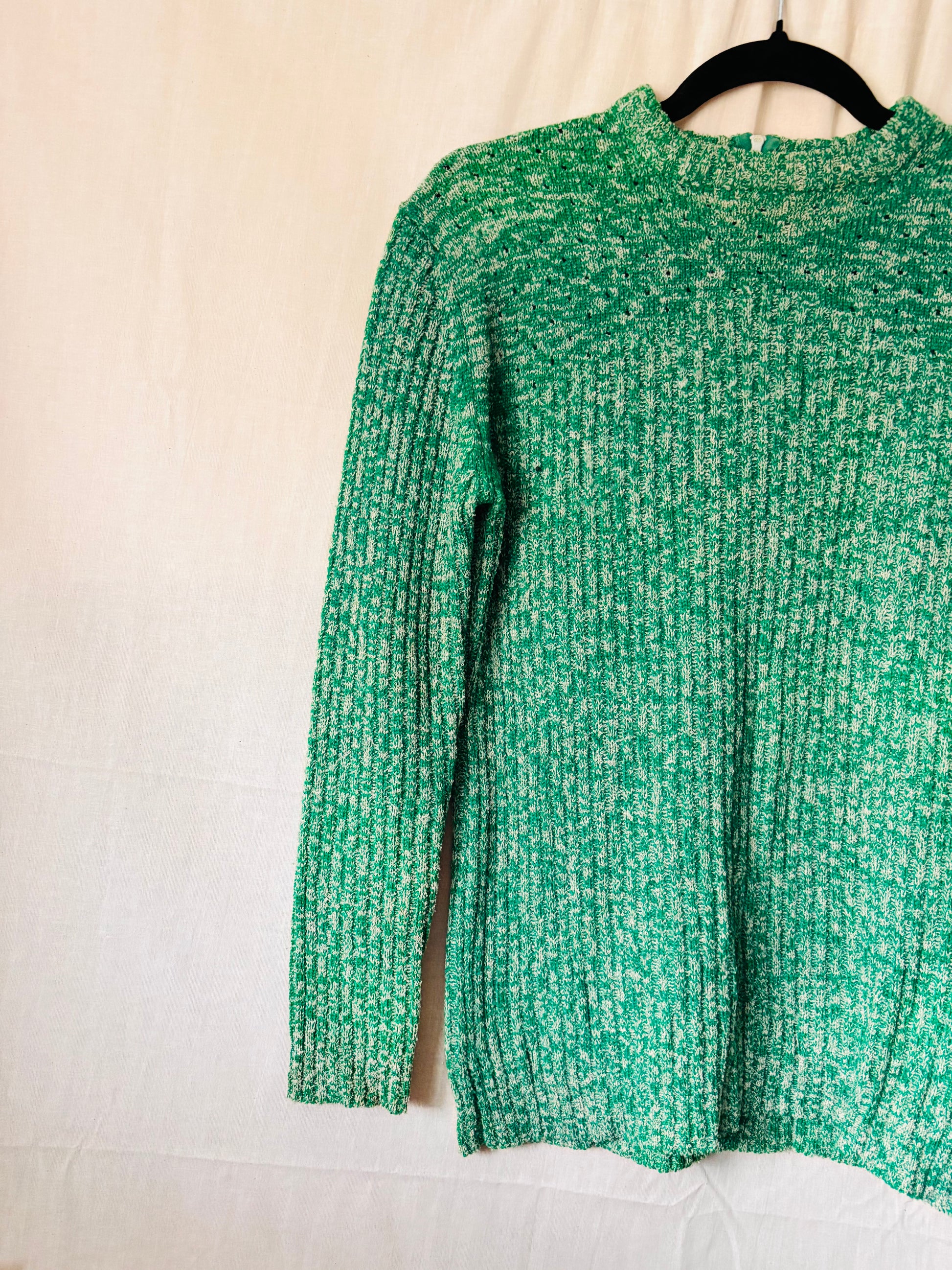 This striking green knit jumper is a rare 1970s piece from the JCPenney Fashions line. Made in Hong Kong, it features a variegated ribbed texture in shades of emerald and mint, with a high mock‑neck, full‑length sleeves and a back zip fastening.