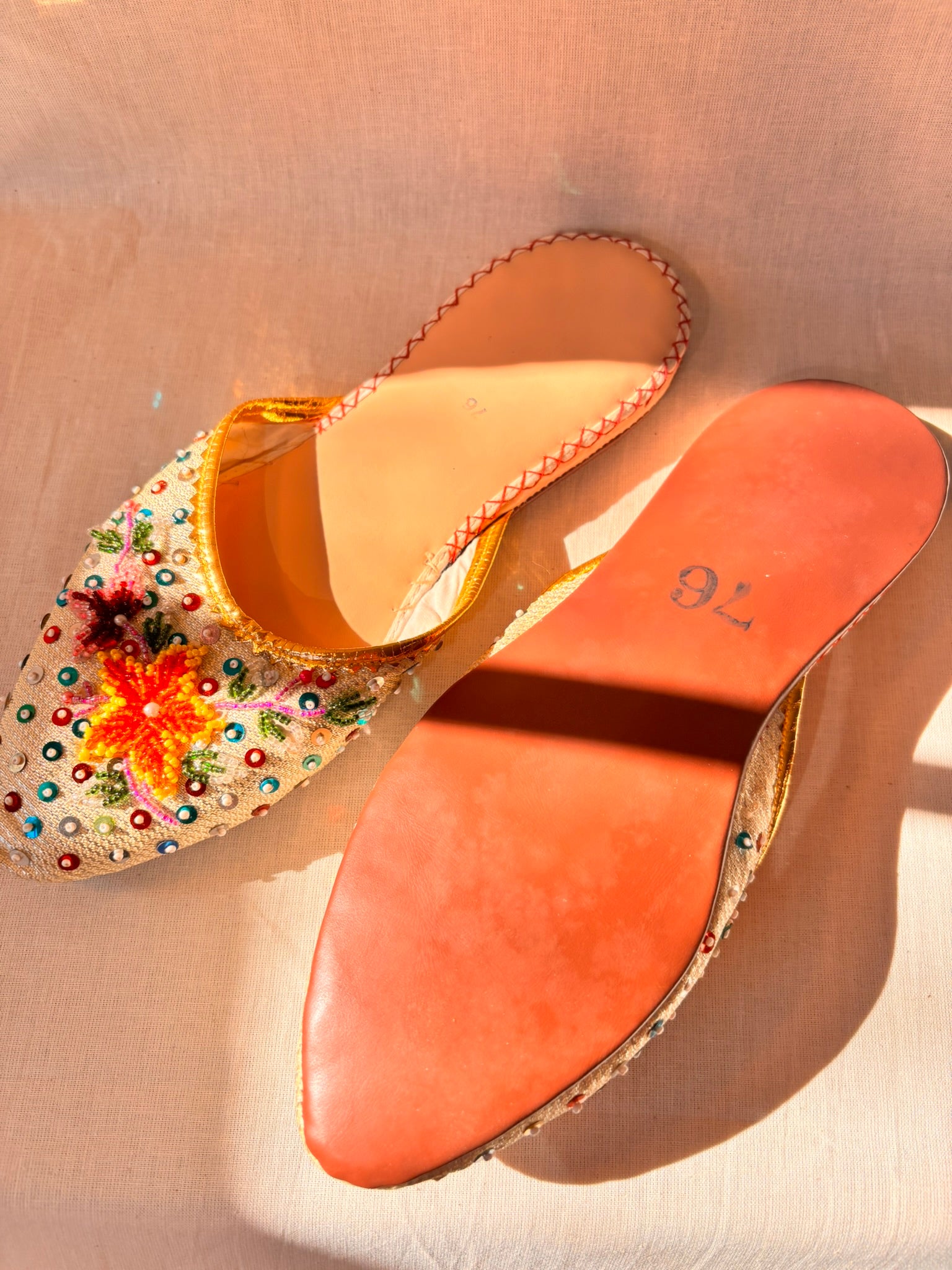 Vintage Chinese beaded slippers with a soft gold-toned base, decorated with delicate floral beadwork in warm reds, pinks, greens and soft blue details. The mix of tiny beads and sequins gives them a lovely texture and subtle sparkle in the light.